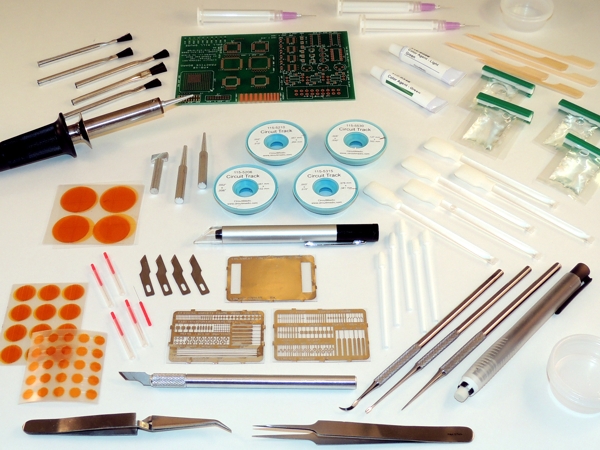 This mid-priced kit includes most everything you need to repair damage to assembled circuit boards, except for plated hole repair.